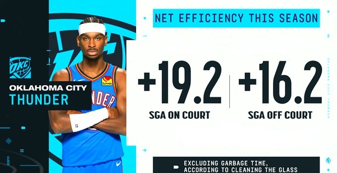 夸张!本赛季SGA在场雷霆百回合净胜19.2分 下场后仍净胜16.2分
