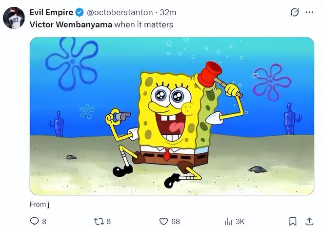 美记:关键时刻的文班亚马就像海绵宝宝。