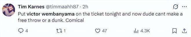 这场比赛文班亚马原本有希望完全杯赛最佳一扣,但最终却扣飞了,他也遭到了各种批判。