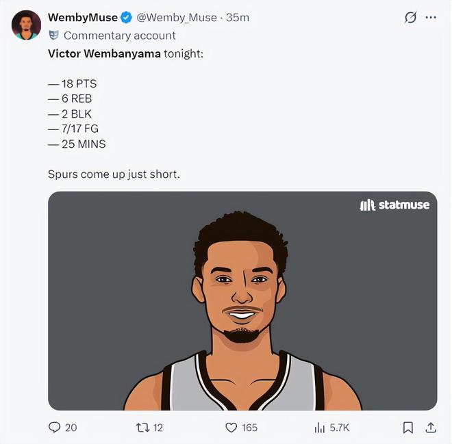 这场比赛文班亚马依旧有登场时间限制,但他打了25分钟,17中7,三分6中2,罚球4中2,拿到18分6篮板1助攻2盖帽1失误,命中率41.2%,三分命中率33.3%,正负值-18。这场比赛跟对阵雷霆完成是两个人。