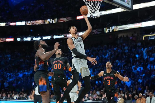 比赛回归:首节比赛便火花四溅。尼克斯这边明确主攻方向,布伦森与阿奴诺比扛起进攻大旗,两人合力砍下 19 分,包揽球队首节 28 分中的绝大部分;马刺则延续多点开花的风格,首节 9 人轮换中有 7 人斩获得分,在胶着的拉锯战中以 2 分优势领先结束首节。次节战局依旧胶着,马刺虽未能拉开分差,但始终稳稳掌控领先优势。尼克斯进攻端依旧依赖布伦森与阿奴诺比的双核驱动,全力追分;马刺则持续多点发力,共有6人得分上 6,带着 2 分领先优势进入下半场。
