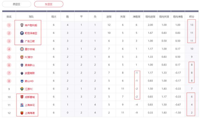 积分榜方面,东亚赛区本轮战罢,神户胜利船2分优势稳居榜首。广岛三箭击败申花后追上盯田泽维亚,2个净胜球的劣势排在第3。申花无力赢球,也就无法超过江原FC,这样的话,中超三强就无法摆脱一起垫底的尴尬,目前的局势,上海双雄很难逆袭进入8强,上港下一轮还不能赢球的话就提前出局,成都蓉城倒还有一些机会,他们落后第6的柔佛新山2分,净胜球也没有差太多。